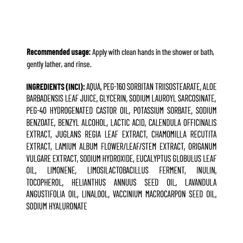 Sestavine: voda, PEG-120 metil glukozni dioleat, gliceril stearat, sok listov aloe vere, glicerin, natrijev lavroil sarkozinat, natrijev kokoil izetionat, hidrogenirano ricinusovo olje PEG-40, kalijev sorbat, natrijev benzoat, benzilni alkohol, mlečna kislina, izvleček ognjiča (Calendula Officinalis), izvleček listov kraljevega oreha (Juglans Regia), izvleček kamilice (Chamomilla Recutita), izvleček cvetov/listov/stebla belega lamijuma (Lamium Album), izvleček urtike dvolične (Urtica Dioica), natrijev hidroksid, olje listov evkaliptusa (Eucalyptus Globulus), limonen, ferment limosilaktobacilusa, inulin, tokoferol, olje semen sončnice (Helianthus Annuus), olje sivke (Lavandula Angustifolia), linalol, olje listov čajevca (Melaleuca Alternifolia), natrijev izetionat.